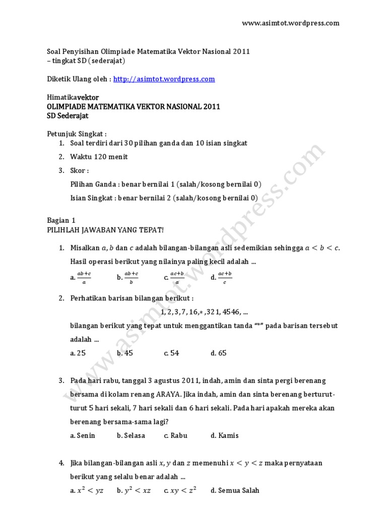 Soal Penyisihan Olimpiade Matematika Vektor Nasional 2011 Tk Sd
